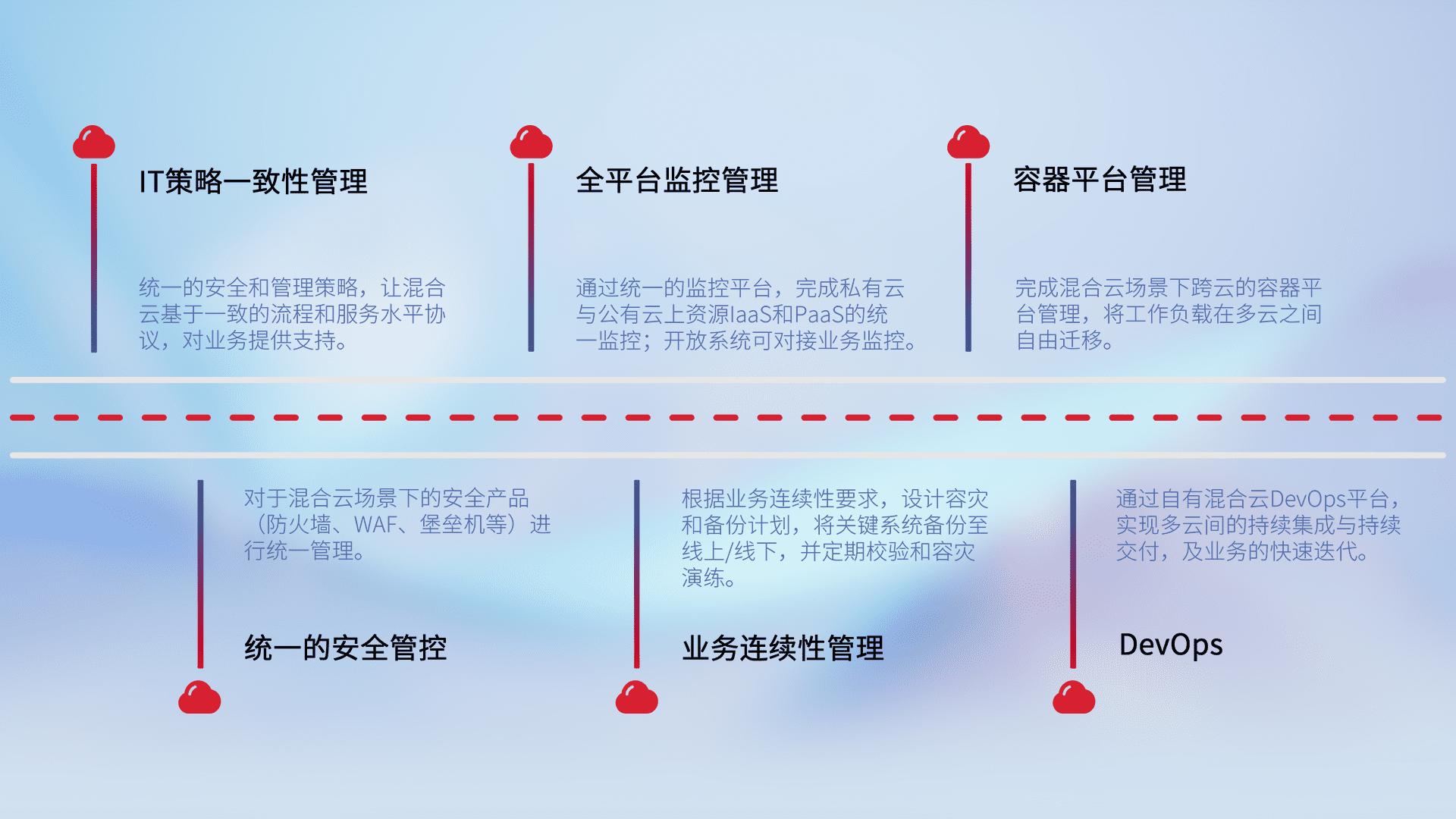 通过多云纳管,,,,以统一的资源数据模型把客户的云资源进行抽象和封装,,,进而实现对多云资源的统一操作,,保障云资源管理的可靠性、、、、稳定性与可用性。。。量身定制化运维内容,,,,配置、、、开发运维、、补丁管理、、备份、、、监控、、、认证和访问管理、、、审计和日常巡检等,,,,保障在用云过程中的可靠度,,,,稳定度以及高可用率。。