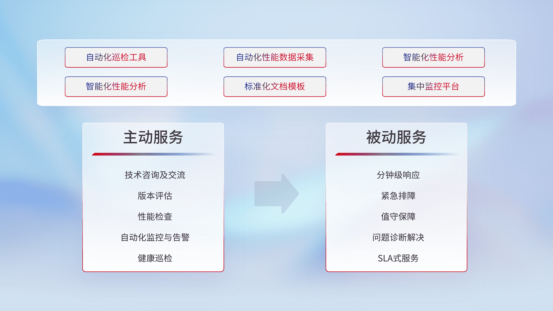 智能化工具和标准化文档,,,,保障服务质量,,提供主动服务(包含技术咨询、、、、版本评估、、、、性能检查、、、、自动化监控与告警、、、健康巡检)和被动服务包含(分钟级响应、、紧急排障、、、、值守保障、、、问题诊断解决、、SLA服务)。。。