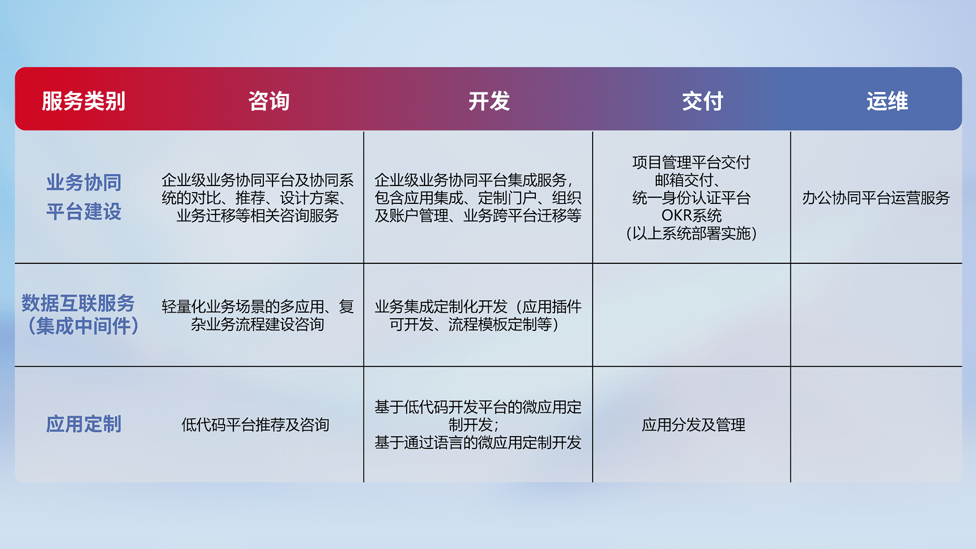 针对钉钉、、企微、、IDaas等平台级产品提供产品的规划、、、方案、、、、交付、、、定制化开发等服务,,实现如统一协同办公、、、智能客户服务、、、混合会议管理、、、、智能数据查询、、、、等业务场景,,,,实现数字化转型。。。。